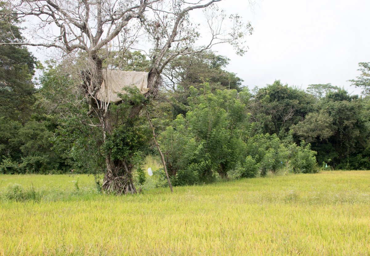 He pointed out a rough Wooden Tree House in the middle of the paddy fields, which are used by night watchmen, who keep a look out for elephants coming into the rice fields - they chase them away with firecrackers.