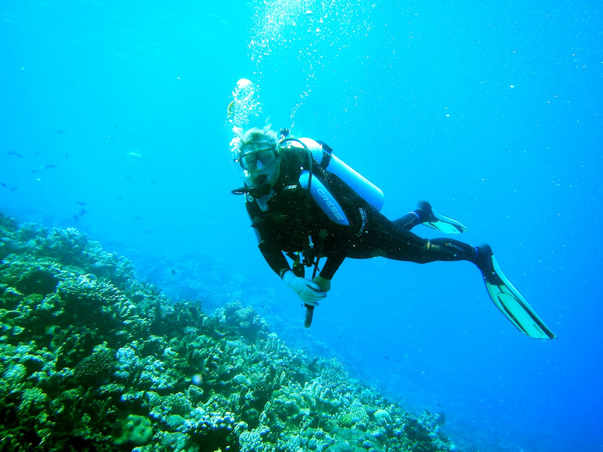 Once outside, we motored along the west coast of Vakaeitu, looking for a dive site called “Coral Gardens South”, but the swell and surge bouncing back off the cliffs on the island looked too big for us to safely anchor the dinghy. We returned to the point where we’d crossed the reef and dropped the anchor in 8 metres of water.