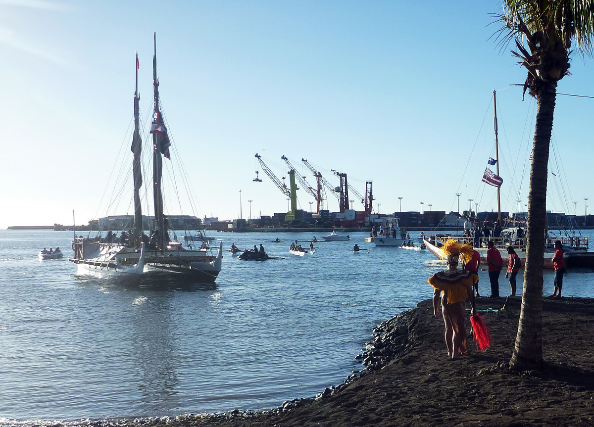 Later in the morning, we walked to the supermarket and, on the way back, discovered something going on in the waterfront park. Teams of people were setting up TV cameras, so we asked one of the TV crew, who told us that a traditional boat was arriving from Hawaii and there was a big welcoming event later in the afternoon.
