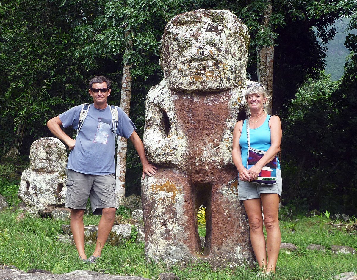 We visited the site of the Laughing Tiki and the large archaeological site of Iipona at Puamau, where we saw the largest tiki west of Easter Island and other ancient structures such as platforms built from stones that were used for prayer and human sacrifice. The ancient artifacts were relatively interesting, but we mostly enjoyed talking to Marie Jo and asking questions about Hiva Oa and the plants as we travelled across the island. She helped us to collect Pamplemousse from a couple of places and we picked small hot chilli peppers that seem to grow everywhere.