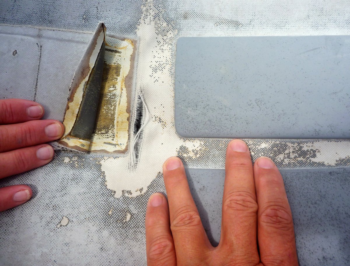 I lifted it on deck and used most of our Hyperlon patching material to repair the tear and to add some reinforcing patches to other areas that are badly worn. The rubberised outer coating on the fabric has now perished and we’re through to the fabric in a lot of areas now – it’s in a very sorry state and I hope that it keeps going and doesn't fail completely while we’re in the middle of nowhere.