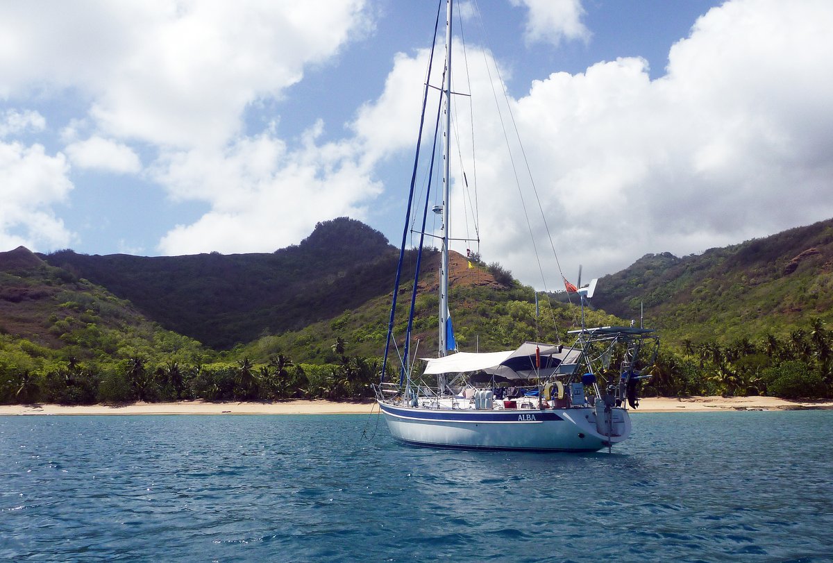 After lunch, we decided that there was little point in staying at Vaitahu – it’s an impressive place with the hills towering above, but a little gloomy with a black rocky shoreline. We upped anchor and went back to Hanamoenoa and what a difference a couple of miles makes. The water here is blue and the verdant green of the coconut palms contrasts beautifully with the white sand beach – it lifts the soul.