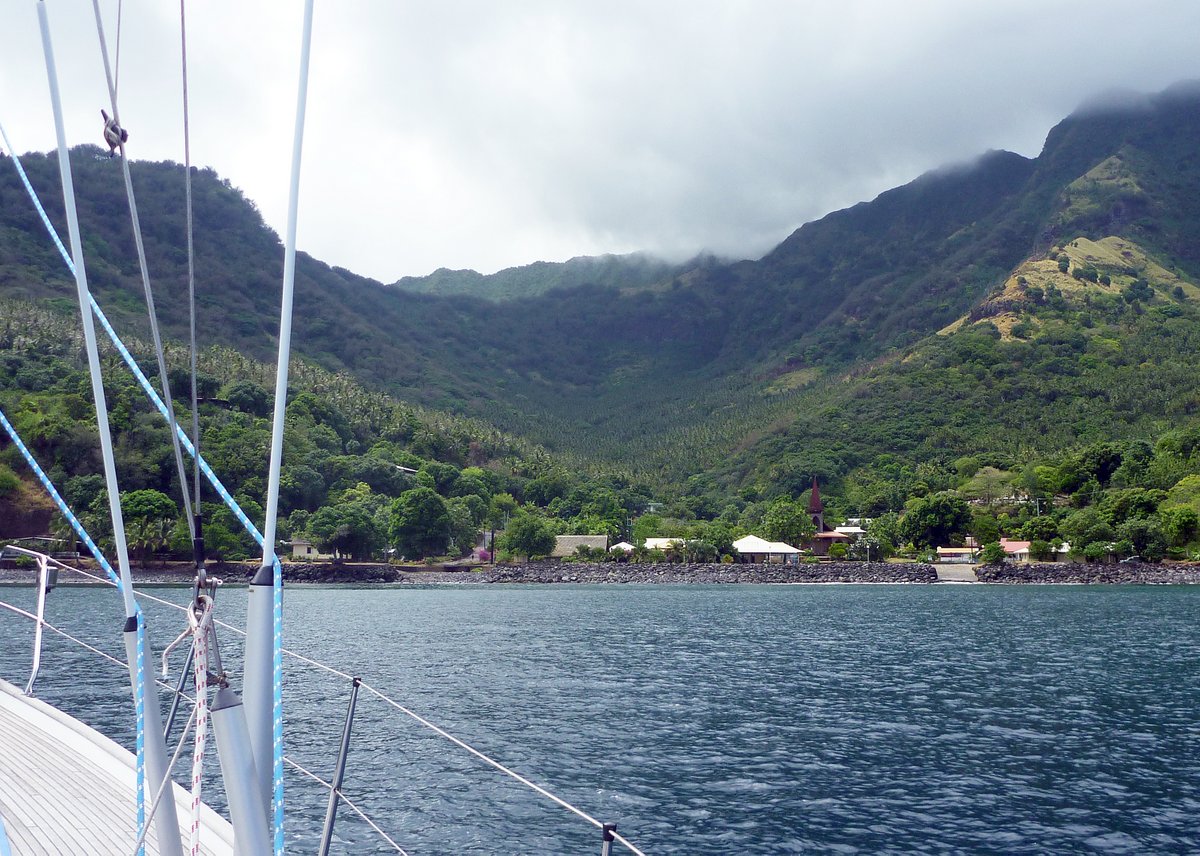 There’s not much improvement in Glenys – this tummy bug is exhausting her. We decided that a change in scenery was needed, so we sailed a few miles down the coast to the small village of Vaitahu and anchored amongst four other yachts. It’s a pleasant anchorage surrounded by steep hills reaching up to a ridge line 900 metres above us. The weather wasn’t very good with rain showers passing through, so we spent the morning on-board.