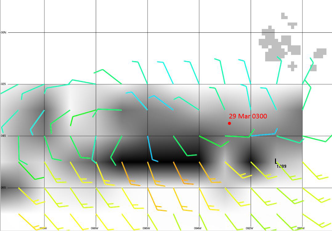 I received an email from Karsten Staffeldt, who’s an amateur weather router living in Panama. I've sent him our current position and he's sent me back a text forecast with details of the surface forecast, a description of a satellite image, the position of the Inter Tropical Convergence Zone (ITCZ), etc. It's great information and a very useful addition to GRIB files, which are raw data from a computer weather model. Unfortunately, this is the first email that I've received from Karsten while we've been underway, so I didn't have his take on the squall until after the event.