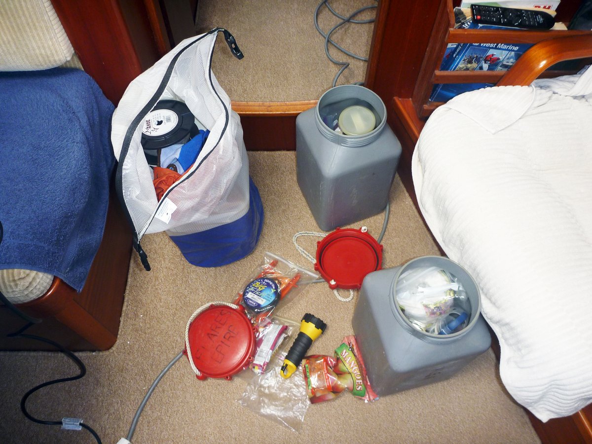 Meanwhile Glenys sorted through our "Grab Bags". These are three waterproof containers, which we'll be trying to take with us in the life raft if we have to abandon ship. Having read a few horror stories of people being ship wrecked and spending weeks surviving in a small life raft, we have been very thorough in what we want to take with us. There are flares, knives, fishing tackle, a plastic cutting board, torch, handheld GPS, first aid, food, etc. There's even a pair of tights to sieve plankton for when we get very, very desperate.