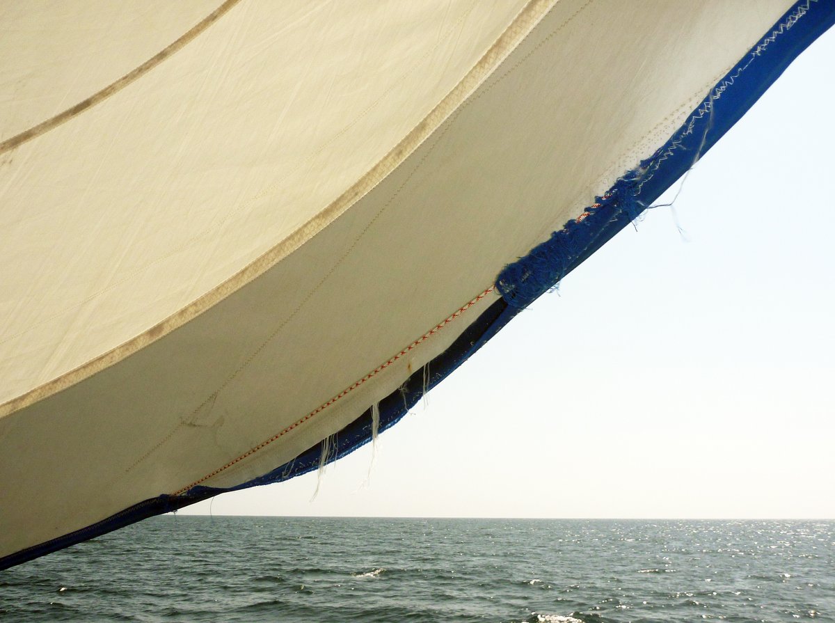 When the leech of the sail ripped, it pulled out the leech tensioning line, which runs inside the leech seam. We spent half an hour trying to thread this 65 foot length of 4mm line back through, but only managed to get 20% of the way before we gave up - the leech would just have to stay un-tensioned.