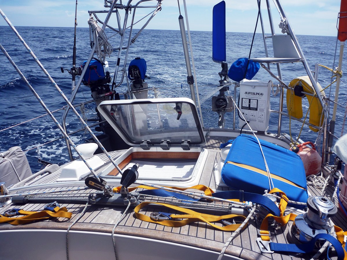 It took Glenys two hours to hand stitch both sails, but the repairs look nice and strong - with luck they will last the journey. Fortunately, the seas were very calm, so doing the repair wasn't too traumatic.