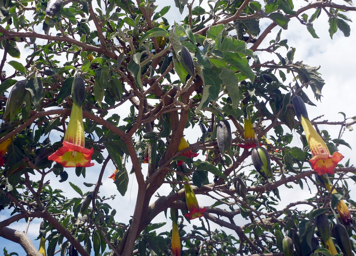 While walking around Ecuador, we often see a shrub with a trumpet shaped flower, which is called Brugmansia. I’ve found out that this plant has narcotic and anaesthetic properties and is used in modern medicine to produce drugs like scopolamine and atropine. It’s been traditionally been used in many South American indigenous cultures as a ritualistic hallucinogen for divination, to communicate with ancestors and as a treatment for unruly children making them more compliant – sort of like a super Calpol... The Incas mixed it with maize beer and tobacco leaves to drug wives and slaves before they were buried alive with their dead lord – nice!
