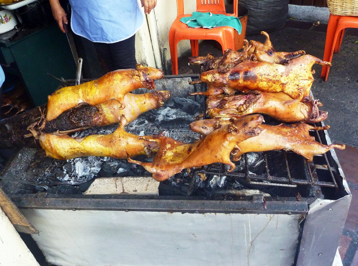 Banos is a holiday destination for both Ecuadorians and foreigners, so it’s packed with hostels, restaurants and small shops selling souvenirs. We came across the local market where there are a lot of eating places. One of them specialises in guinea pig, which they cook on a barbeque. It’s pretty expensive ($20 for a large one) and we’ve been told that it’s incredibly fiddly and difficult to get a decent amount of meat from the skinny little things. We didn’t bother and had a more filling Almuerzo Tipico for $2.50.