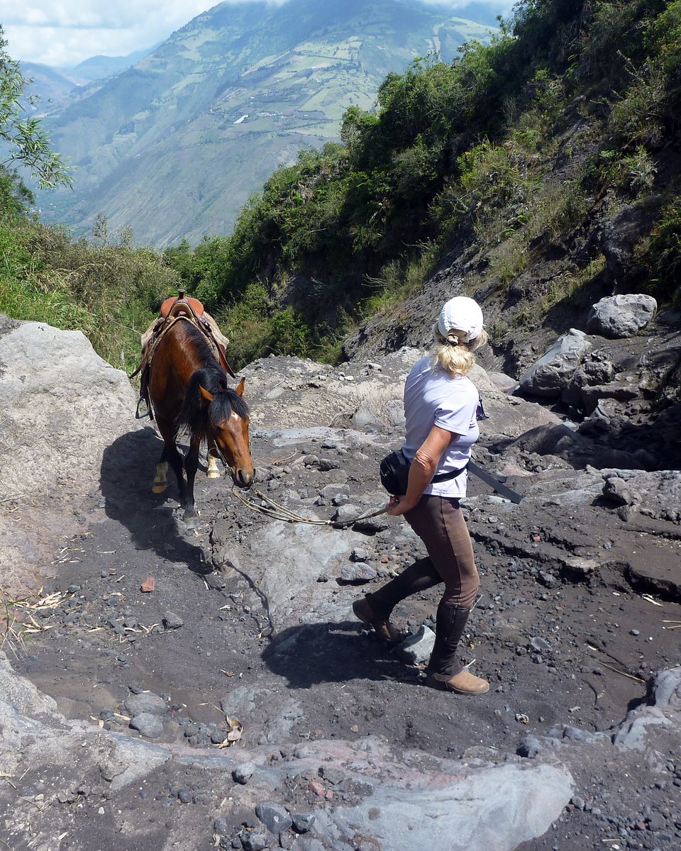 After about 90 minutes, we stopped in a meadow high above the valley and had a bite to eat. Pablo was a mine of information about the volcano, which became active in 1999 after a long period of quiet. The last serious eruption of Tungurahua was in 2006 when a pyroclastic cloud swept down the slopes (where we were riding), wiping out all the animals and vegetation in its path. It took only five minutes for the cloud of hot ash to reach the river valley below. Molten lava flowed out of the volcano crater and took an hour to flow down several canyons. Five people died and hundreds of people had to be relocated - Christian lost all of his 12 horses.