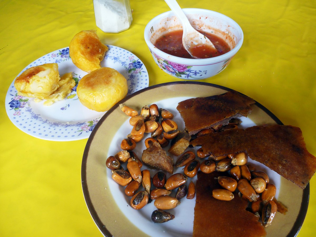 By the time that we’d got back to the car it was lunch time, so we got Johnny to stop at a road side eating place on the way back to Cuenca. While travelling on the bus yesterday, we’d seen quite a few of these places, which display a whole roasted pig by the roadside – they looked intriguing. It turned out that they sell a local speciality called Plato de Cascara which is deep fried pork, roasted corn kernels, topped by thin pieces of roasted pig skin. Thankfully, we only ordered one plate of the stuff because it was pretty grim. The roasted corn is very dry, the deep fried pork pieces were rock hard and the skin was (errr) crunchy, fat-soaked skin.