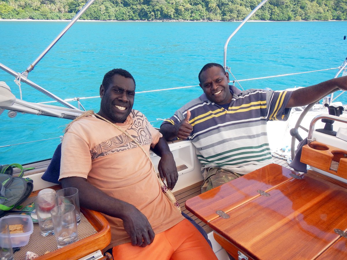 The sail along the sheltered west coast was fabulous, sailing on a broad reach in flat seas past spectacular cliffs and even a waterfall. We enjoyed it so much that we even tacked upwind into Southwest Bay before anchoring off Lembinwen village in 5 metres of water over dark sand. An added bonus was catching a small Bonito.