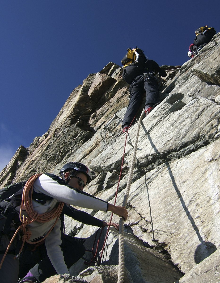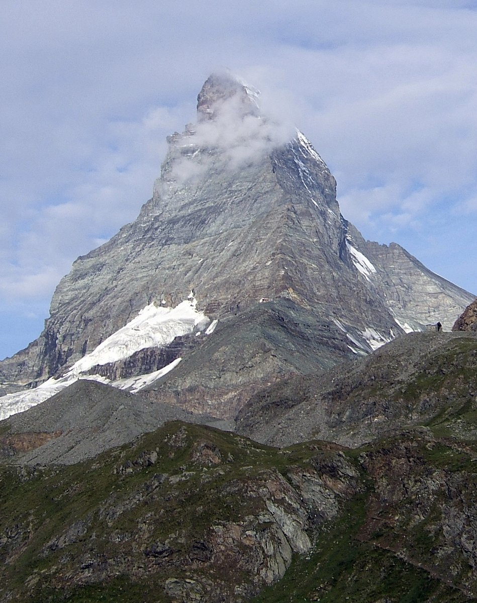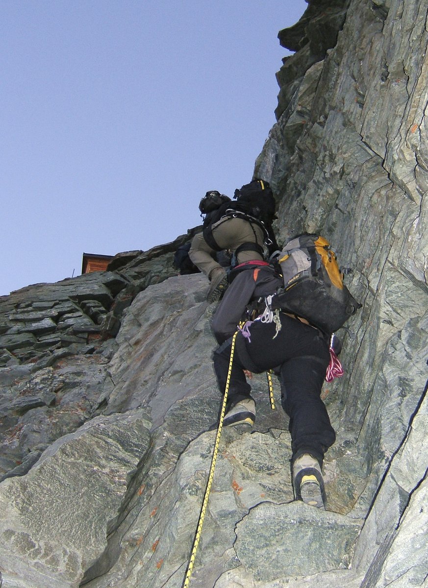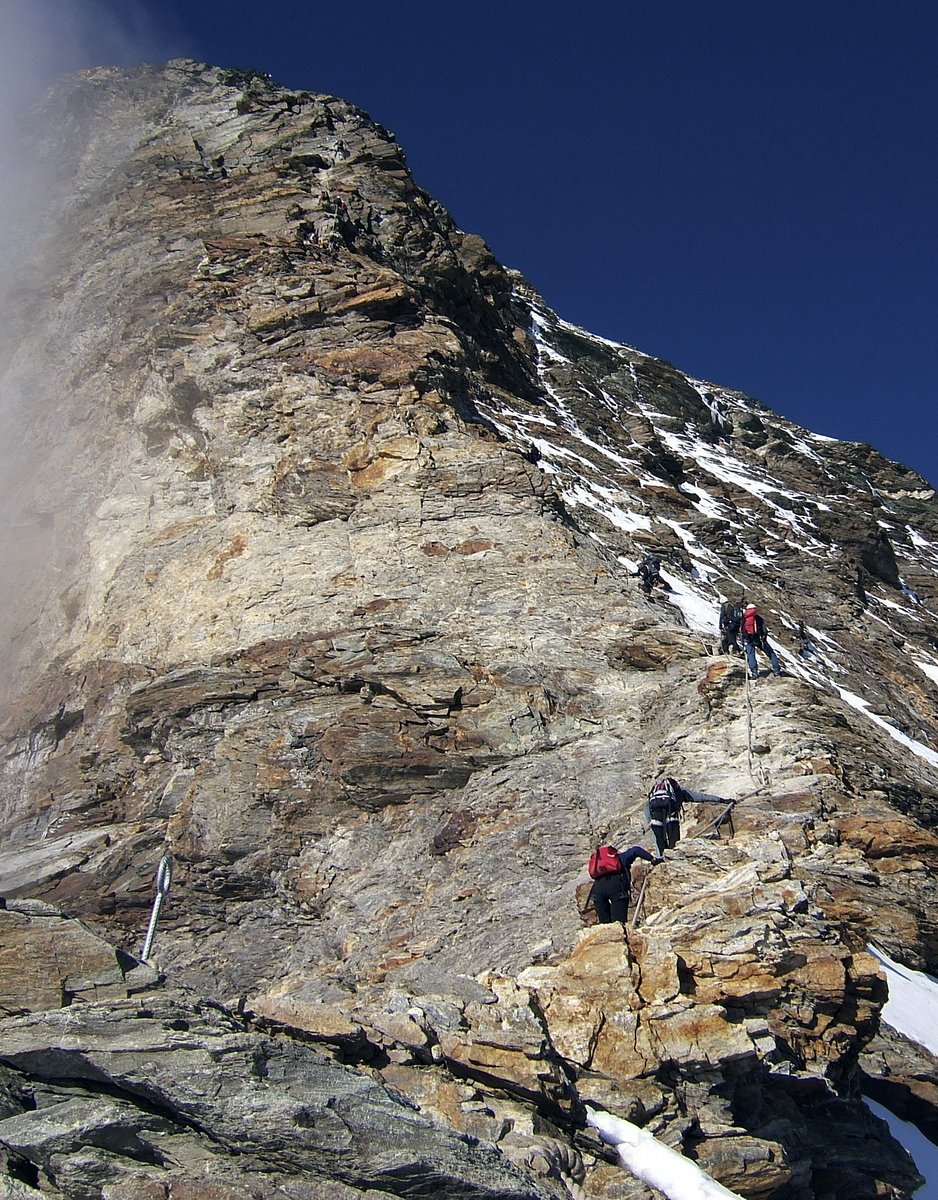 From the Hörnli Hut one walks horizontally to the first step on the ridge. This is climbed upwards to the left, usually with a fixed rope or chain. From this step a traverse is made left to a small shoulder which is climbed a short ways before traversing left again on to the east face to the second couloir which is climbed for about 25 meters. Then on to the rib to the left, which is followed back to the ridge crest. The ridge crest is followed for about 100 meters before another detour on to the east face via a ledge in yellowish colored rock. From the end of the ledge, one climbs back to the ridge under a large tower where the remains of an old hut are located.