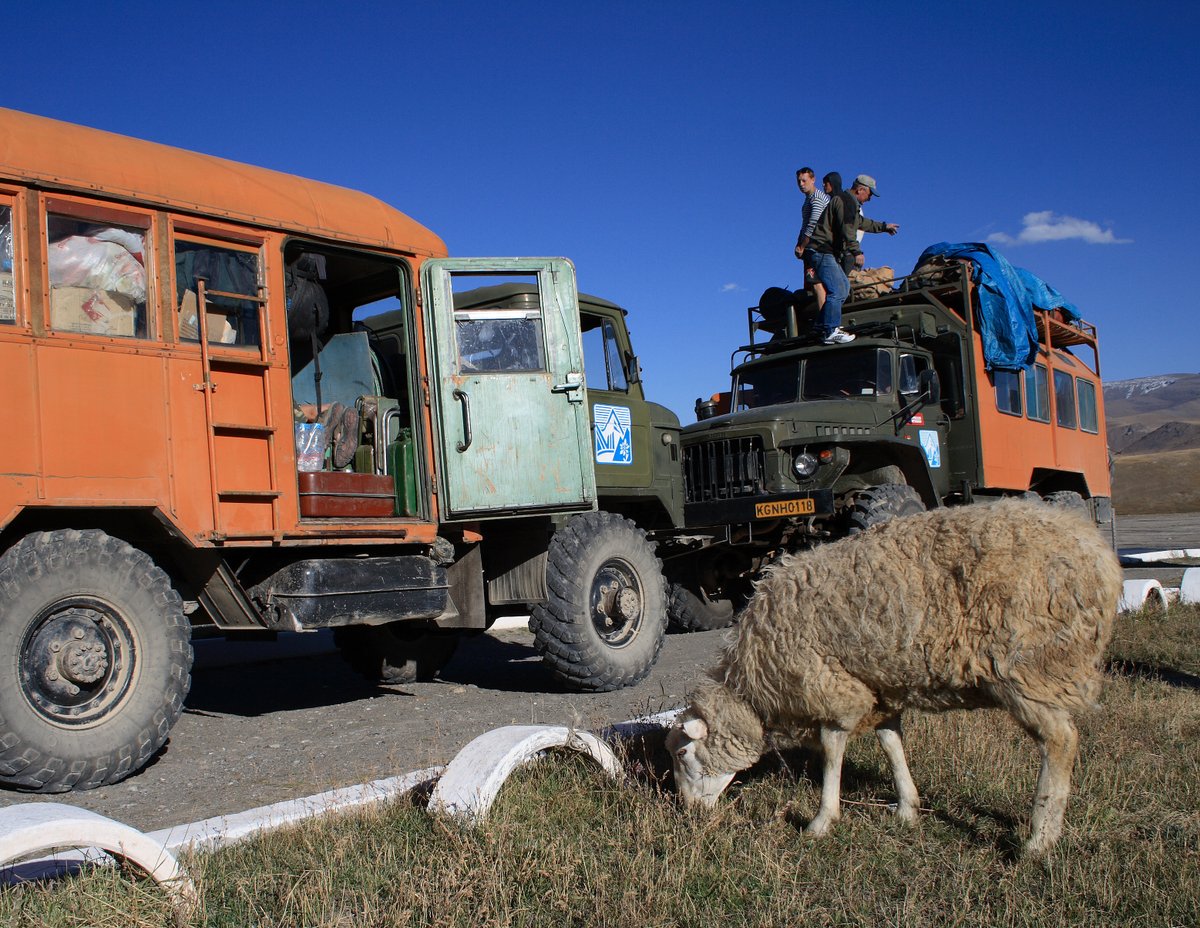 Eventually, Vladimir decided that we had better go back to find the small truck, so we all piled into the large truck and headed back down. We found it about a mile away struggling up the steep track. The solution was to connect a cable to it and tow it up to the Military checkpoint. It turned out that the truck was struggling was because it has a dodgy fuel pump (which had apparently been a problem for a “few trips”. By this time, we had lost a couple of hours, so Pat was getting a little tetchy and had a word with Vladimir about perhaps fixing the fuel pump. Vladimir simply shrugged and said that “it always has trouble getting up steep hills”. (Later in the evening, Sasha changed the fuel pump). This appears to be a common Kyrgyz attitude – “don’t fix it unless it’s completely broken”.