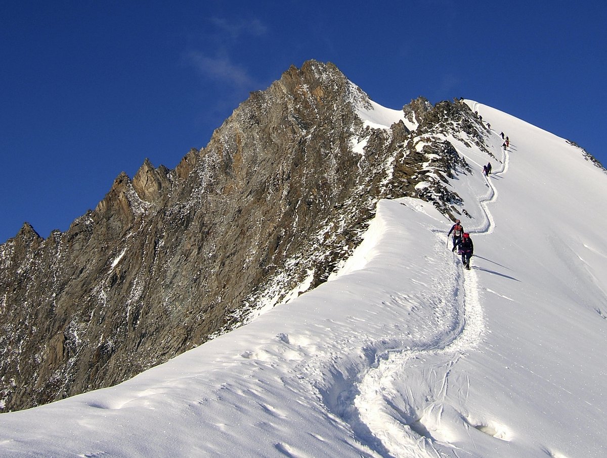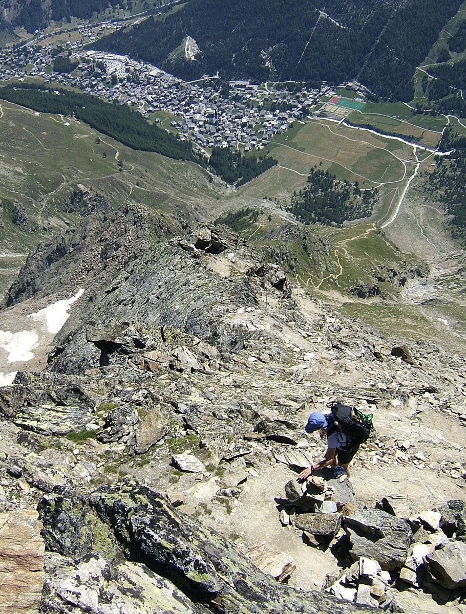 A big party of twenty people was trying to come up as we tried to go down. A young Italian lady stopped everyone and let us go first – what an organiser. Then we had to queue on the rock parts going down. Some people obviously didn't like down climbing and in frustration, I took us off-route and we scrambled past the slowest group. It was a walk down the snow arête with our burning thighs and knees. The snow because softer as we descended and just like on the Weissmies and we ended up sliding with each footstep, which makes it even harder on the thighs.