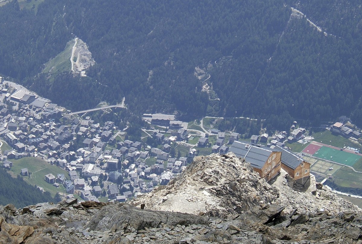 After our ascent of the Weissmies, my wife Glenys, my son Craig and I drove to Saas Fe and booked into a small hotel near to the Hannig cable car. The next day we rested, walking around the town and gently exercising our tired legs preparing for an attempt on the Nadelhorn, which is one of the dramatic 4000 metre mountain peaks dominating the Saas Fe valley. (View Location)