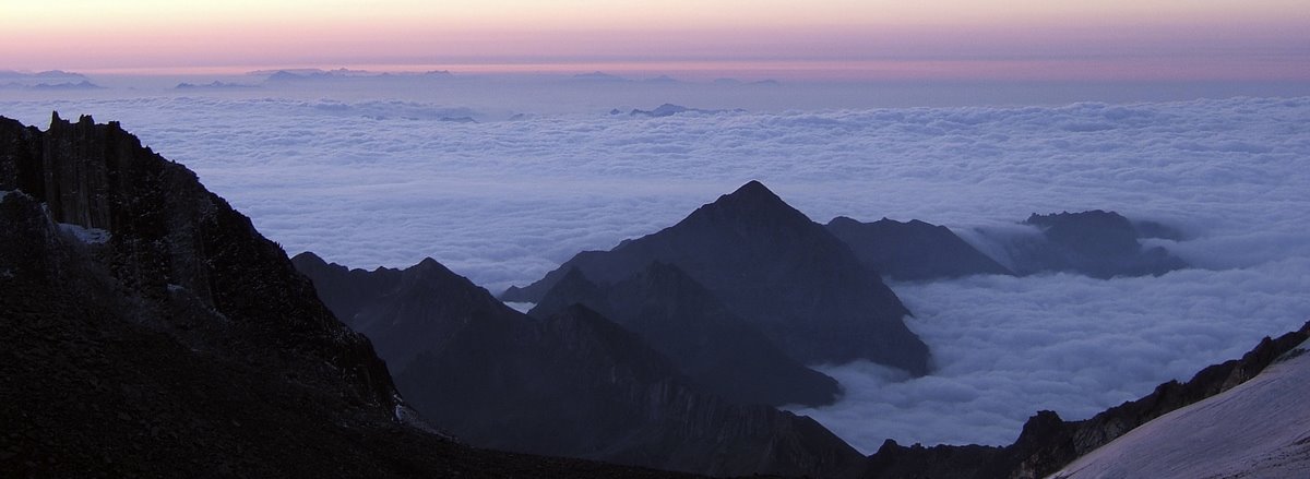 I started off far too quickly because I was nervous, so within five minutes we had to stop to let Glenys catch up. She normally walks methodically uphill and I'd set a mad pace. We stopped several times before tagging on behind a group going at a reasonable slow pace, which was much better than mine. It was a real grind up to the Zwischbergen pass and we arrived at the top just as the sun was rising in the valley on the other side of the pass. We had a fantastic view being higher than the clouds filling the valley below us.