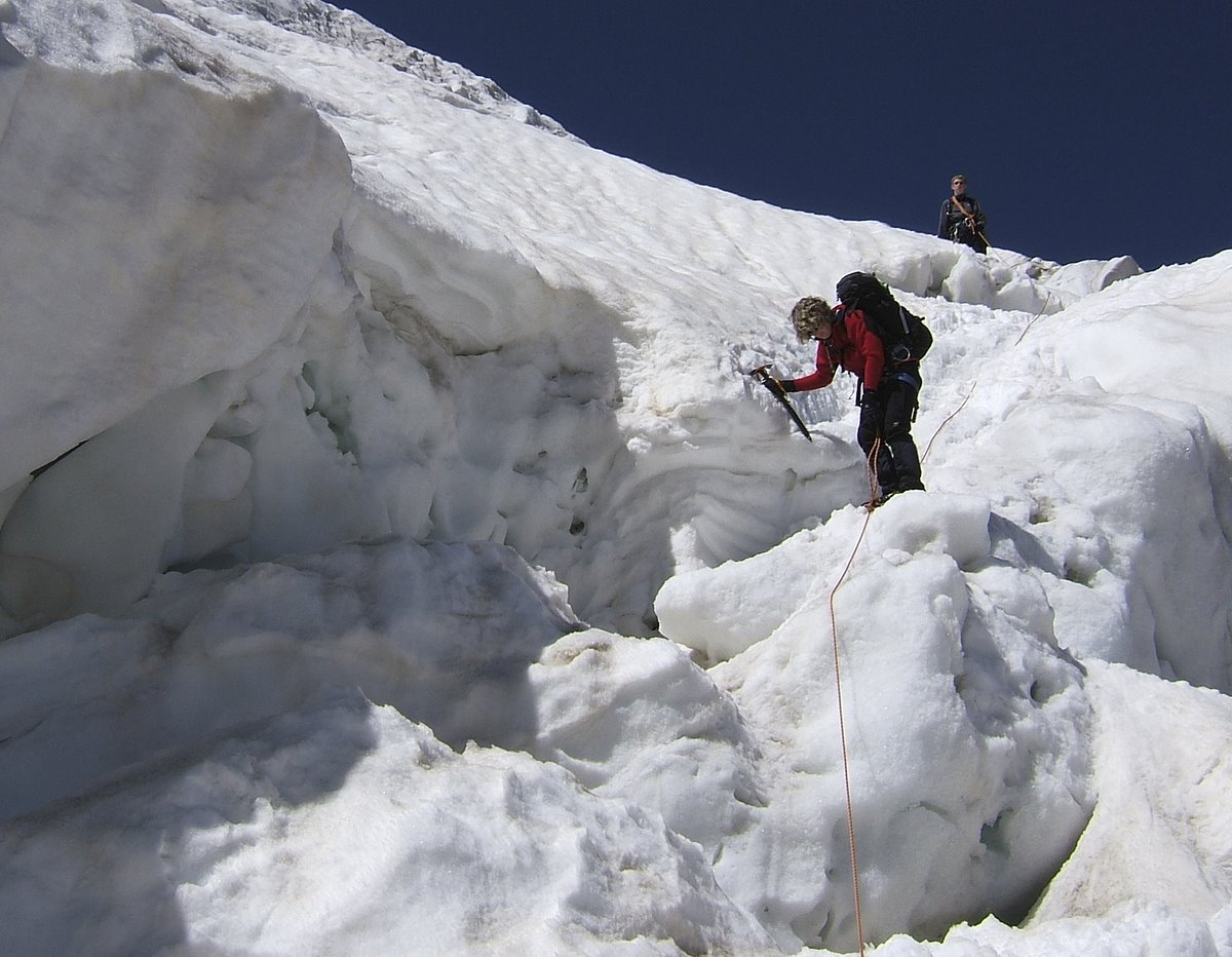 We quickly put our harnesses on and I went over to the group and asked “Have you done this route before?” They pointed at a Swiss guide and said “He has”. I asked him where the route went and his answer was that “If you don’t know the route then you should follow us”. I laughed and asked if the route went to the right of a big block. He shrugged and said that he thought right of the block.