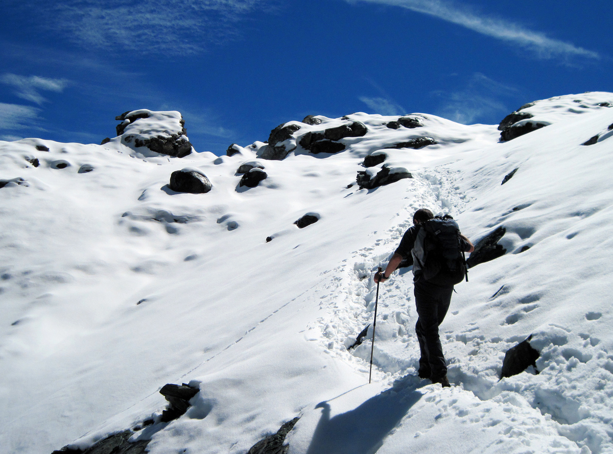 An hour later we stopped for lunch - it was beautiful sitting in the snow surrounded with mountain peaks and blue skies. From there it was tough going because the path across scree was covered with soft, melting snow which was over 300mm deep in places. Having to lift your feet up that high for every step at 3000m is tiring. In addition, we had to be careful when placing our feet otherwise they would slip away. A fall down the steep scree slopes would not be much fun. The path was fairly shallow with lots of long zigzags. This meant that it was easier to walk without sliding back, but it took ages to gain altitude.