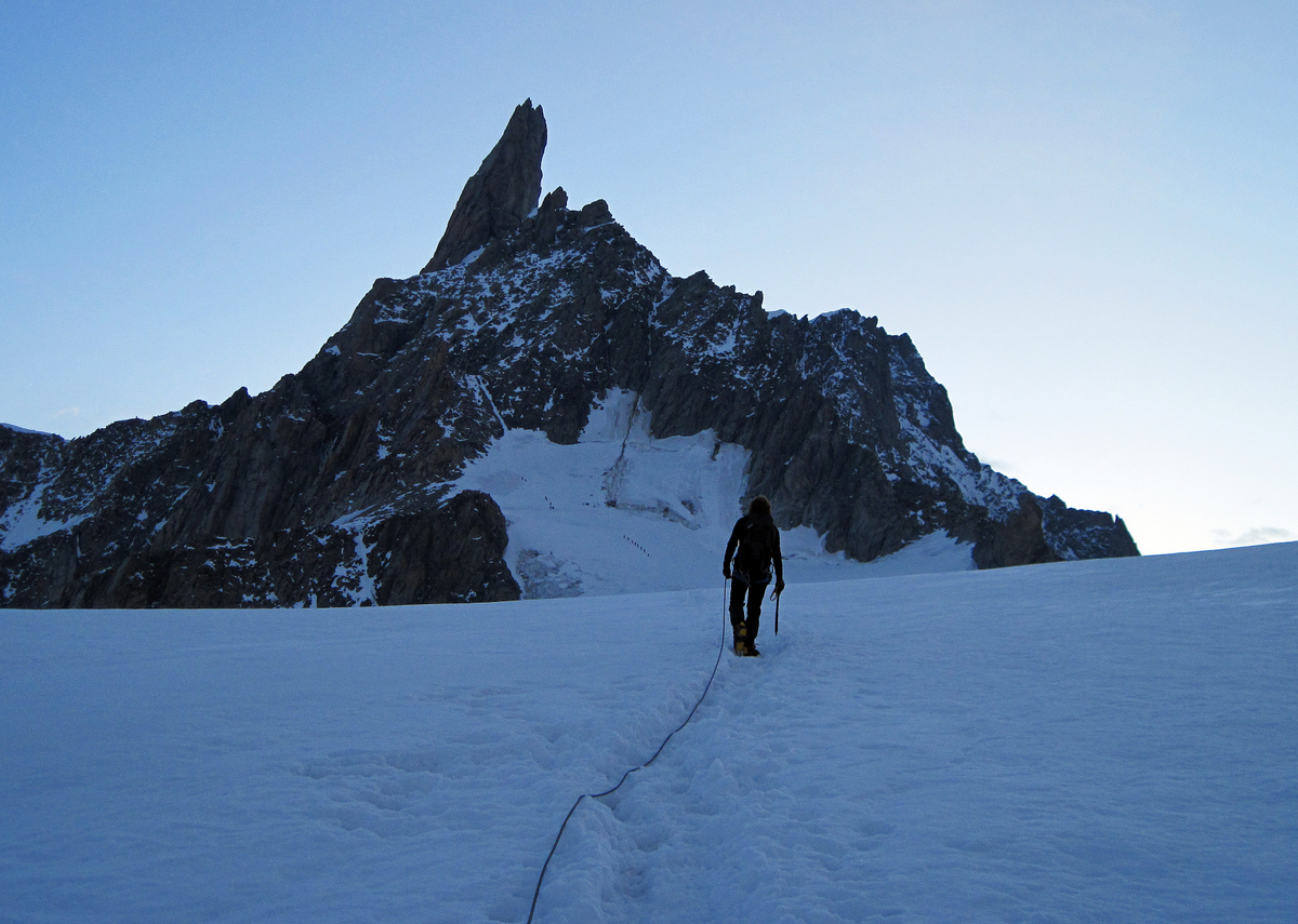 We walked out on to the patio and put on waterproof jackets, hats, head torches, crampons and sorted out the rope. So it wasn’t until 0550 that we stepped onto the crunchy snow of the glacier. The sky was just starting to lighten, but we still needed our head torches. We set up the rope with 20 metres between us with me leading. A group set off before us and I resisted the temptation to follow them, instead setting off down a trail in the snow towards the Dent du Geant that was just becoming visible. It’s always a bit disconcerting being in the front...