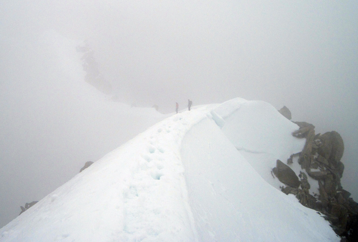 After ten minutes of walking slowly along the knife edge Arête with 10 metres of visibility, Glenys asked me, “How far are we going?”