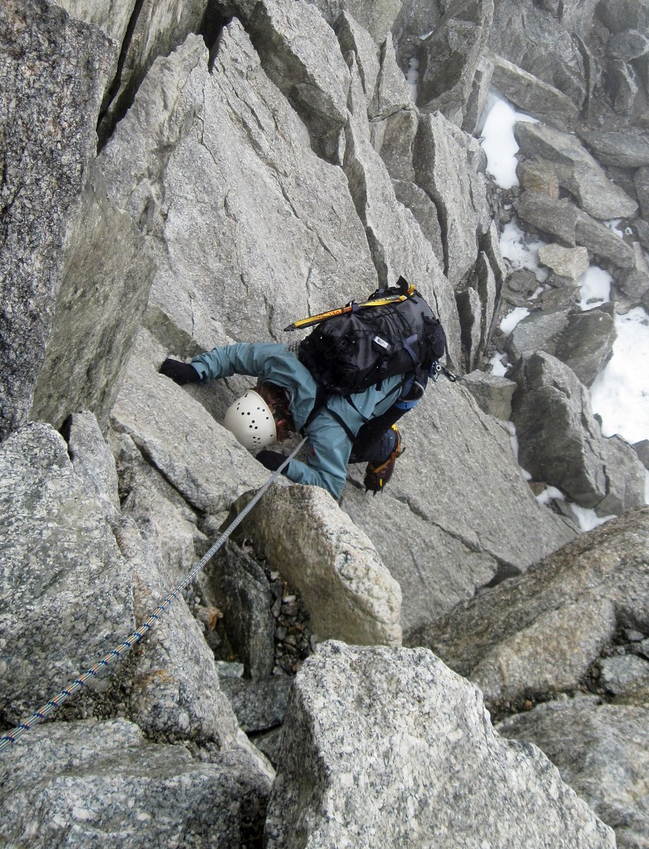 At half past seven, we reached the rock ridge that was the next part of the route. There’s a four metre wide gulley which leads up to the ridge. It's 45 degrees and 150 metres long, but very soft snow so it was a bit of a plod.