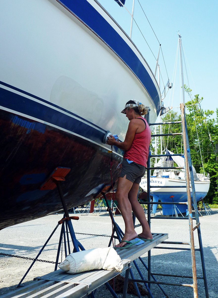 Chuck moved the stands that are holding up our boat allowing Glenys to paint the remaining hidden patches with antifouling. She then moved back onto polishing the topsides.