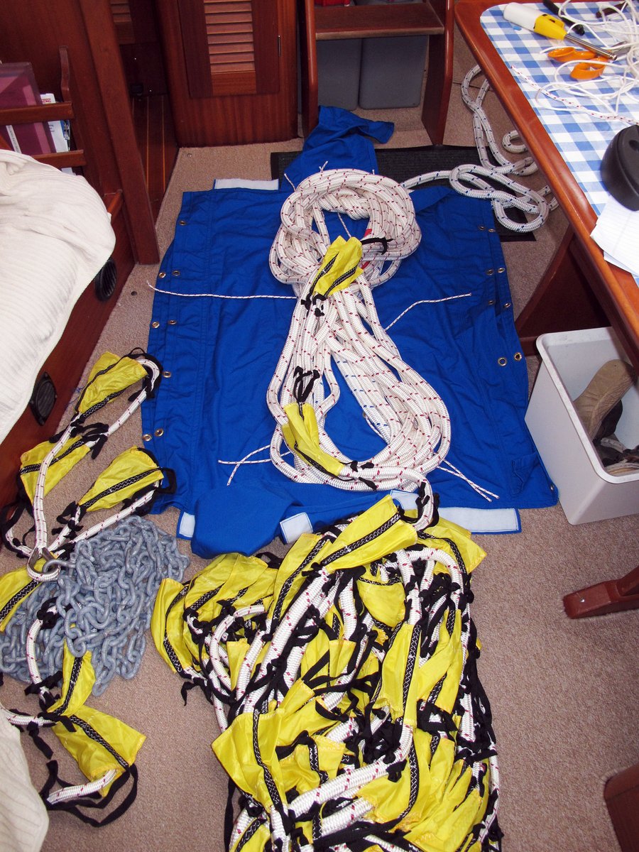 The deployment bag is designed to ensure that the rope doesn't tangle when it’s being deployed. I've based it on the same principals as a parachute container with flaps and I’ll stow the line in a figure of eight to prevent tangles. It all seemed to pack away nicely – I just hope that it works. If we have to use this drogue, it will be a horrible storm and I want it to be as easy to deploy as possible – the nightmare scenario is getting it all tangled up.