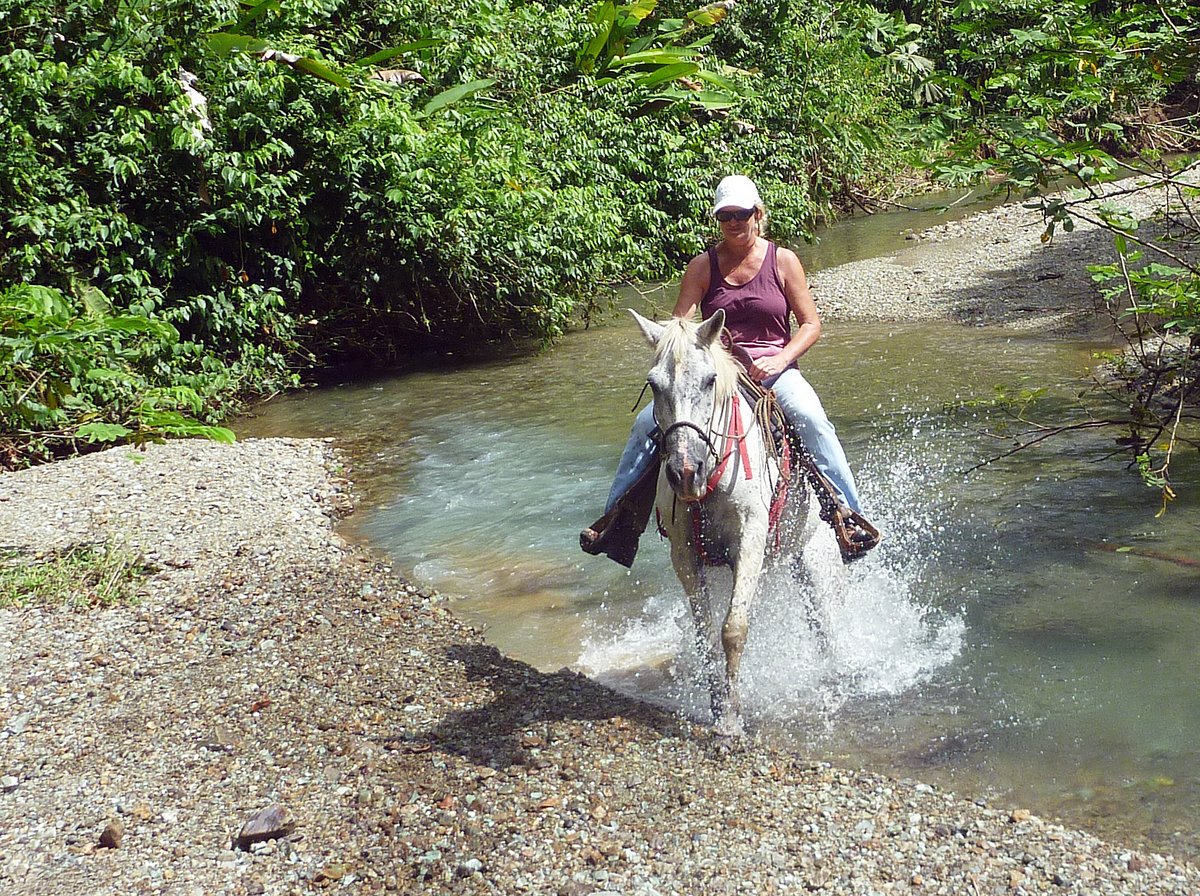 At one point, our guide had to chop through a tree that had fallen across the river, but the trunk was only six inches in diameter and he soon had it out of our way with his sharp machete. Our progress up the river was eventually stopped by a huge tree blocking the whole river, so we went back along the river to our starting point. The ride was only just over an hour, but was very enjoyable and interesting. This has whetted Glenys’ appetite and she can’t wait to get to Ecuador to do more riding.