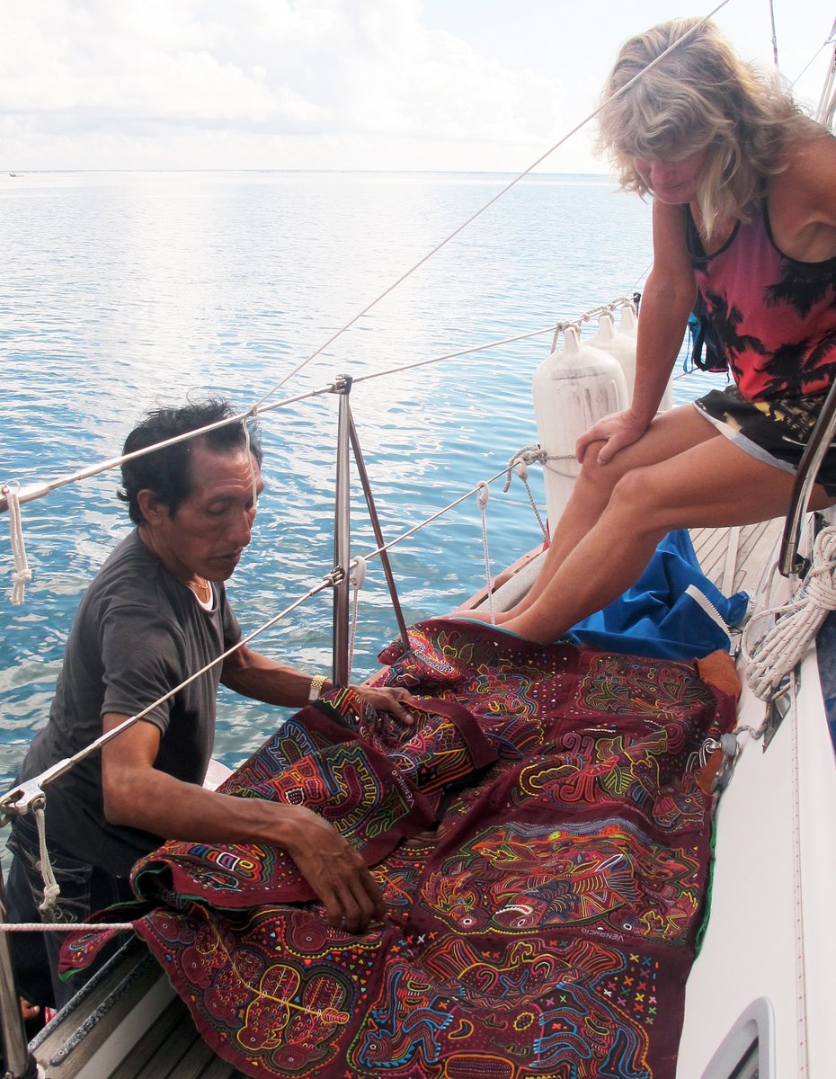 Some of the local Kuna Indians came over in their cayuco and Glenys added to her collection by buying another mola. She’s only bought four so far, but we’ve only been in the San Blas four days and she can’t resist them – I’m getting worried…