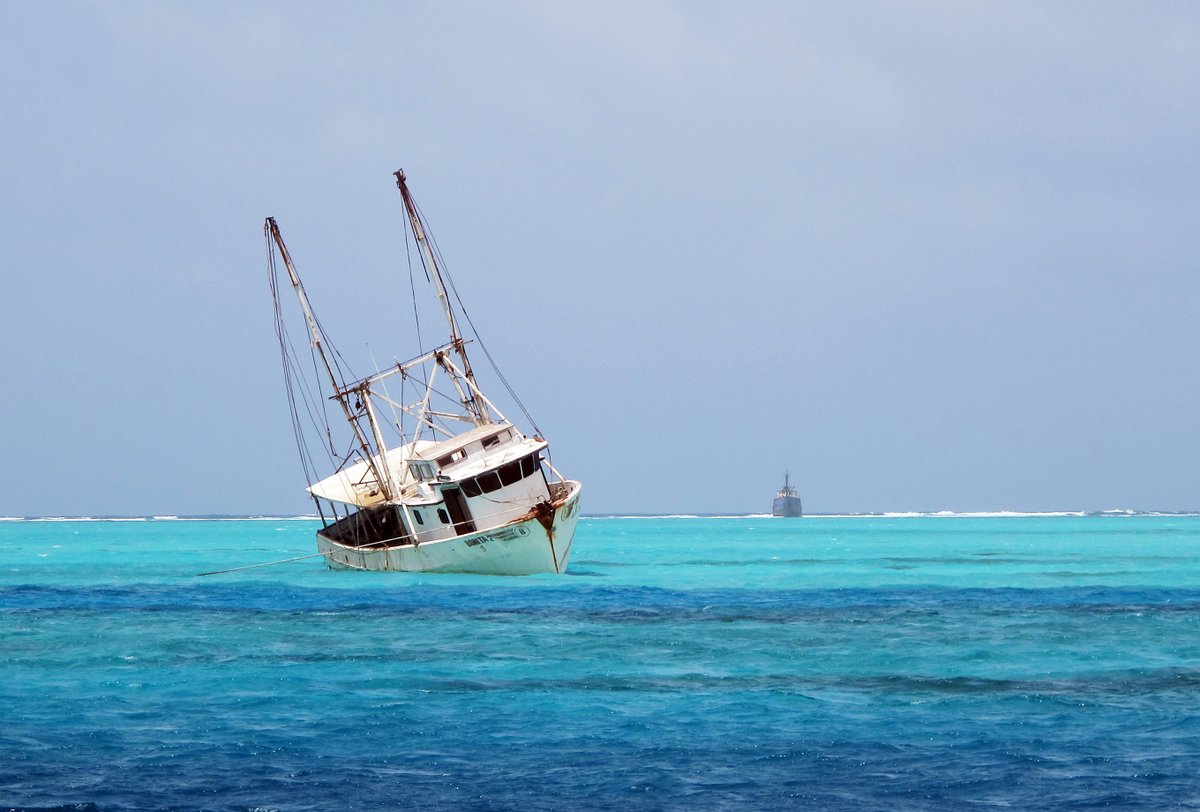 We had to sail south along the fringing reef of San Andres for five miles, going past the anchorage and then turned around a breaking reef into the ship channel. It’s quite worrying going along the edge of the reef because there are quite a few wrecked ships perched high and dry on the reef. We gybed around the outer sea buoy and sailed into the harbour at around three o’clock past some small islands covered with tourists. The water colours were stunning reflecting the intermittent sun off the white sand sea bed.