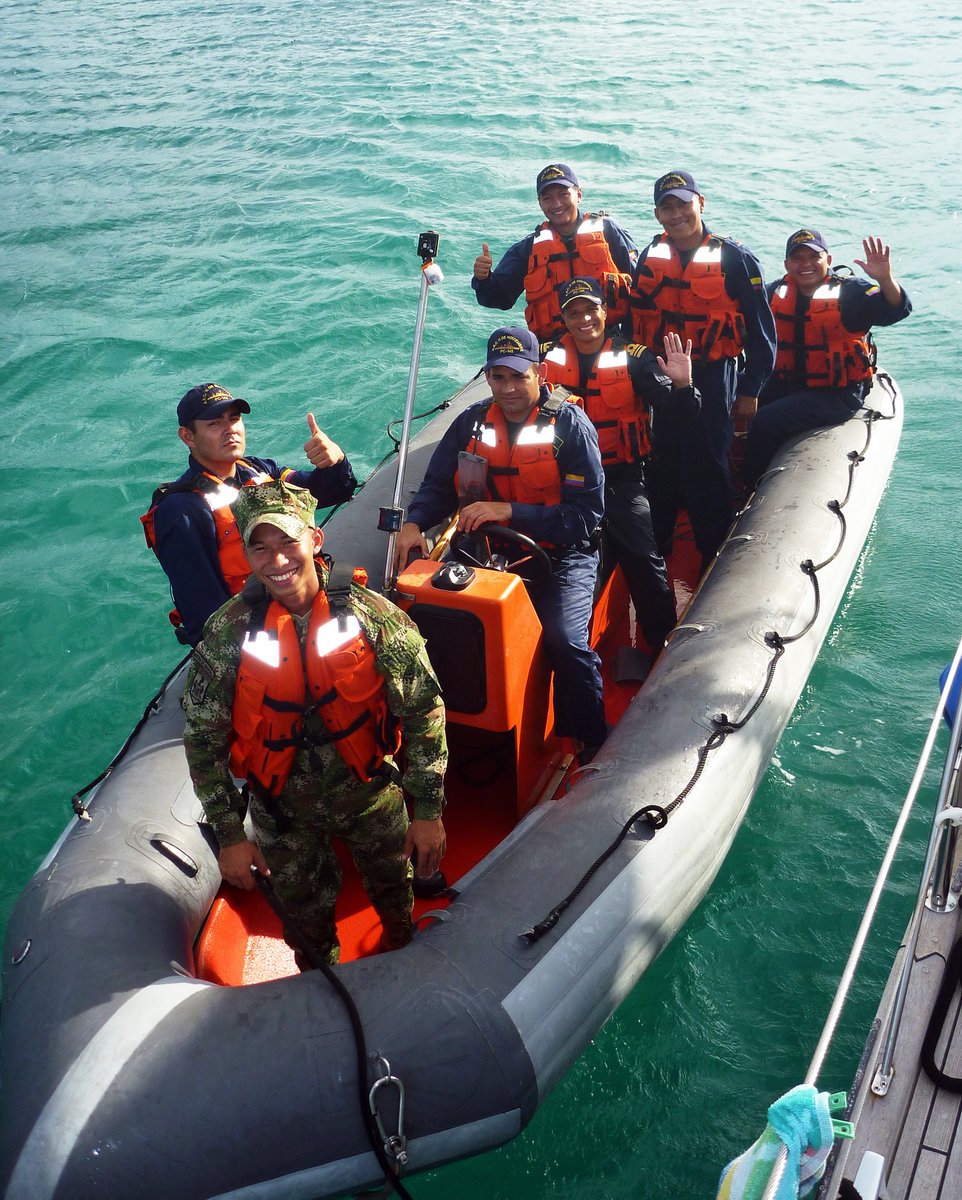 We had a visit by the Colombian Coast Guard who showed up in a big RIB. They‘d come from the Coast Guard cutter that we’ve seen patrolling the area. Four of them came aboard in their big black boots and while the officer inspected our papers, two of them wandered around the deck inspecting our deck equipment – well, more curious than inspecting. They were all very friendly and the officer said that if we had any engine or other problems that we should call him and he could send someone over to help. They left us with some Colombian navy promotional gifts – a couple of small notepads, some cardboard sun visors and two fridge magnets!