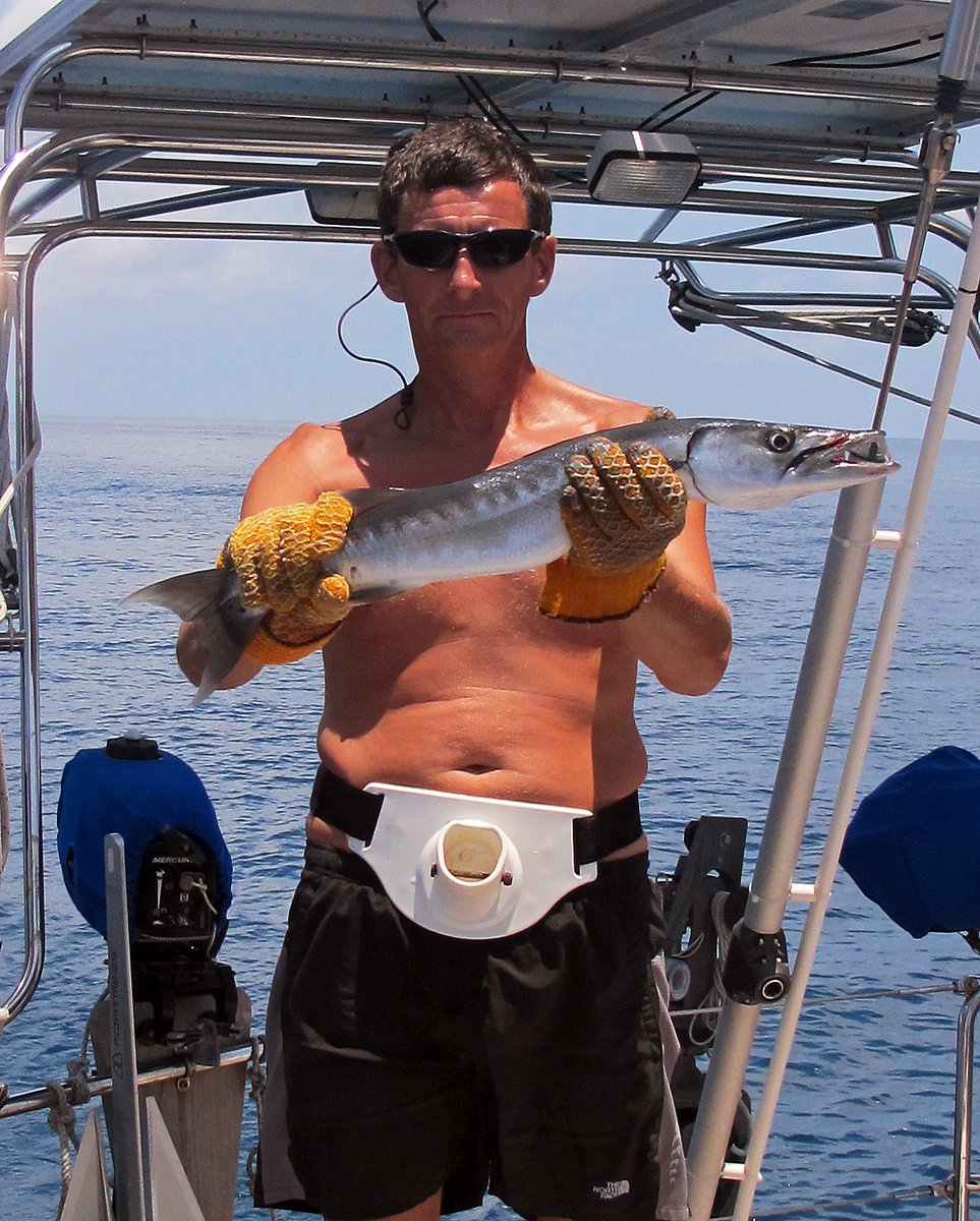 By eleven o'clock, we were heading south towards Montego Bay, but the damn wind had come around to the south east and dropped to less than 5 knots, so we had to turn on the engine.  To compensate, we caught a nice 2-3 lb Barracuda.  We've been throwing these back for the past four months because of the danger of ciguatera, but the agriculture officer in Cayo Largo said that the south coast of Cuba is safe, so we're going to risk it – they’re so good to eat.
