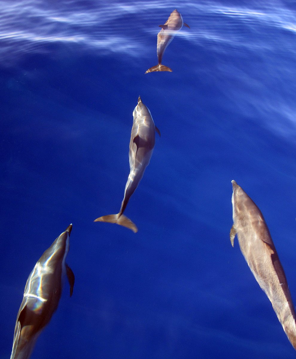 I went to bed for an hour and when I awoke, we were drifting along at less than a knot, the sea was calm and Glenys was on the front deck taking photographs of a school of Common Dolphins who were slowly swimming around us in the glassy sea.  We watched them for ten minutes before I hit on the idea of jumping in to photograph them, but unfortunately, they wouldn't come any closer than 25 metres from me.