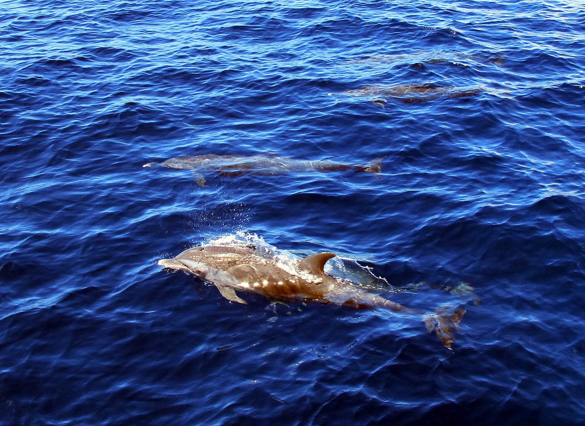 We were up early and motored out into the flat calm sea.  After an hour, Glenys spotted a lot of splashing off to starboard, so we went over to have a look.  It was a huge pod of Common Dolphins that were in a feeding frenzy - I suppose that they had a bait ball of fish because there must have been fifty or so dolphins rushing around in a very small area.  We watched them for ten minutes before leaving them to it.