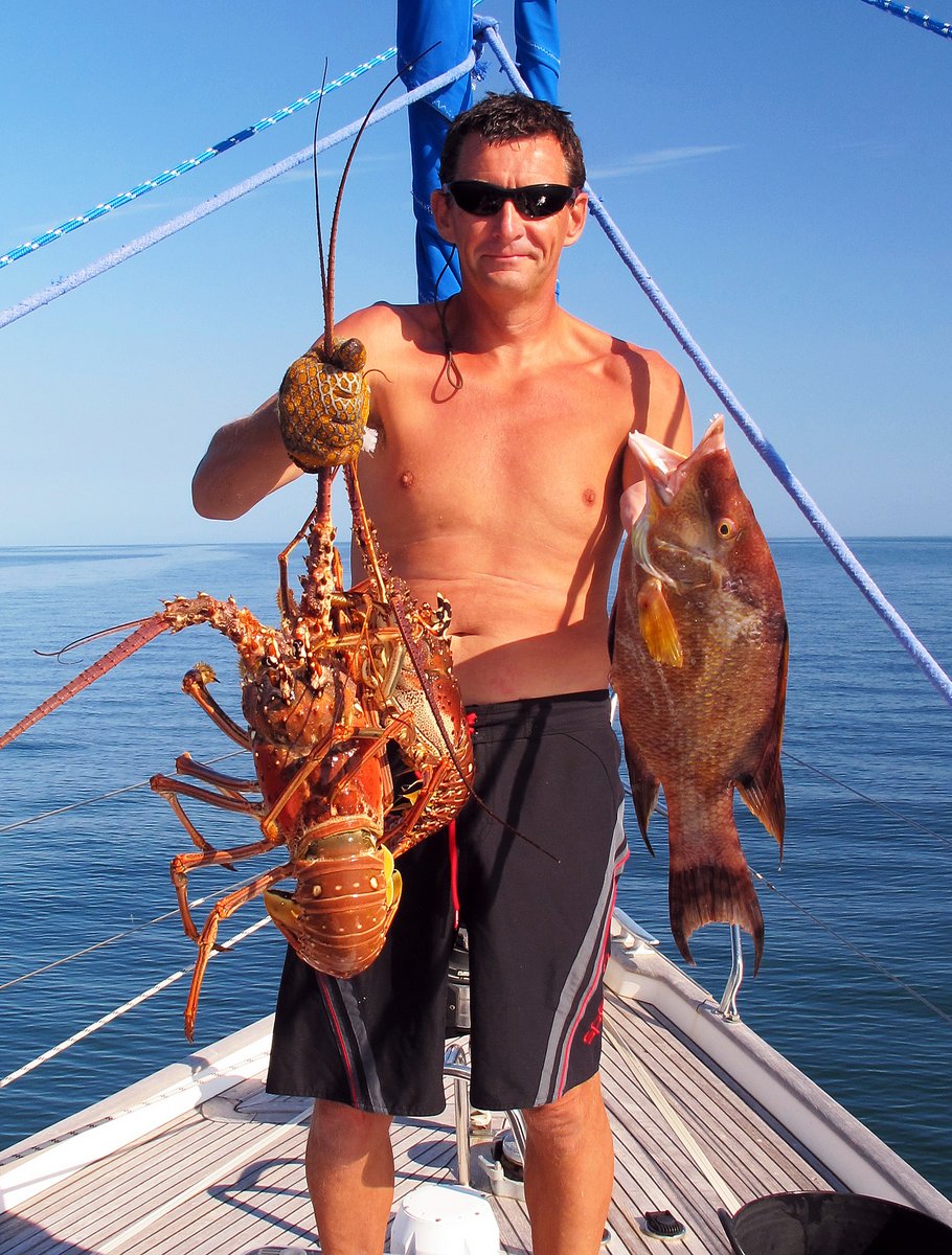 I went over to chat to Yaco and Crystalle on "Songerie". Yaco is a very keen spear fisherman, and like me, was desperate to get out on the reef. So he and I went out hunting on the reef which was two miles away - thank goodness that we have a fast dinghy. The sea was very calm, so we anchored outside the reef in six metres of water. The reef was rocky, but lots of fish - we each speared a 4lb Hogfish and I snared a couple of lobster, one of which was an eight pound monster.