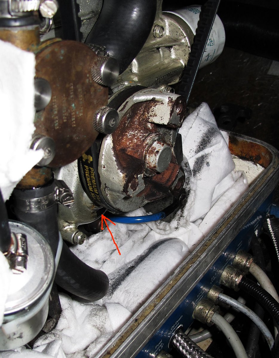 I looked at the generator. The freshwater pump and alternator seemed to be turning okay, so I guess that the belt broke because I’d over-tightened it and it was old. It took me half an hour to remove the remains of the fan belt which had wrapped itself around the inside of the fan belt pulley – the rubber had heated up and fused in place. I cleaned up the generator and tray underneath to remove all traces of oil and bits of rubber. While I was working on the generator, I noticed that one of the sea water hoses had a kink in it, so I turned off the seacock and shortened the hose to remove a tight bend.