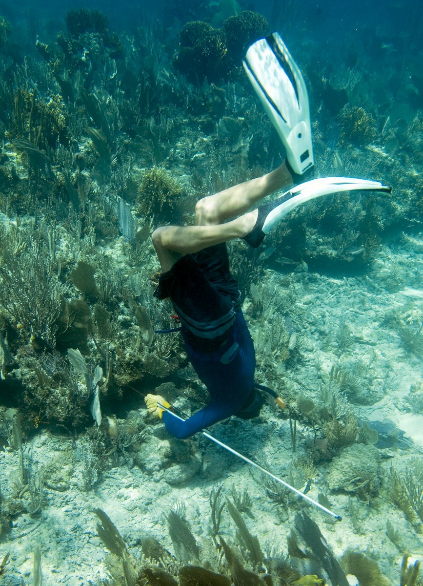 We went snorkelling in the afternoon again, which was very good, but I didn’t get anything to eat. I tried to spear a big Hogfish, but my little pole spear wasn’t strong enough to penetrate the thick scales around its head. I also stalked a huge black grouper and got within four foot of it, but then I hesitated for too long to get a good shot and it evaded me. I also caught a couple of lobster, but both turned out to be female with eggs, so I let them go - not my best day's fishing...