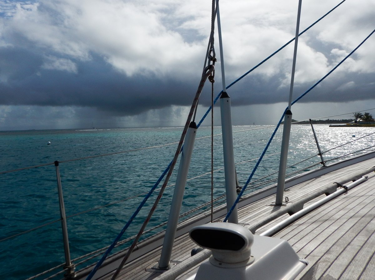 There was enough light to see at 05:40, so we upped anchor, put two reefs in the main and set off. The passage across to St Vincent was very pleasant with a good 15 knot wind and one metre seas. We motored up the leeward coast of St Vincent for an hour and then ran straight into a big squall system at the north end of the island.