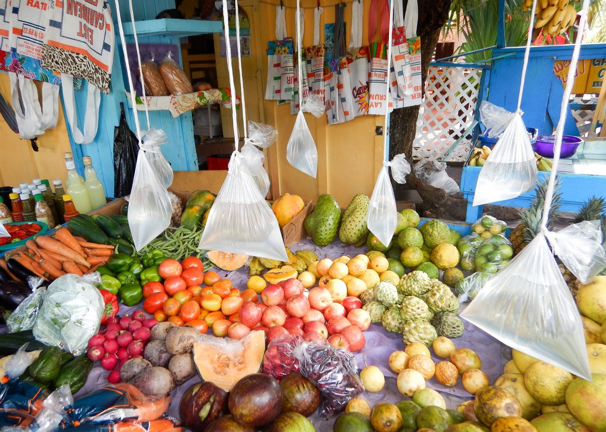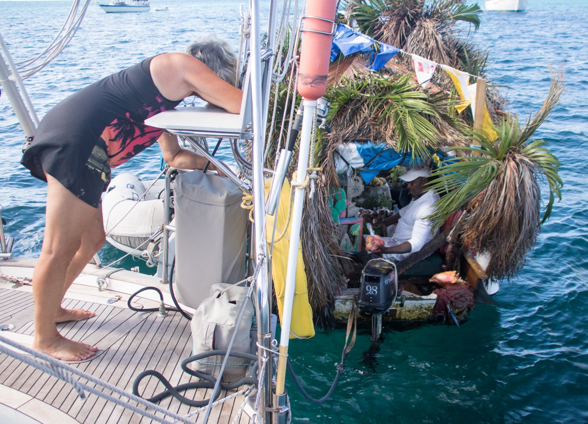 We hadn’t been to a shop for a few days, so we hopped in the dinghy and went into town. I like Bequia, it’s a laid back, colourful place. Glenys stopped at one little vegetable stall, where there were clear plastic bags filled with water hanging from the ceiling over the fruit. It’s a way of keeping Houseflies away, something to do with the refraction of light confusing the fly’s vision, so they buzz off. The lady on the stall was convinced that it works.