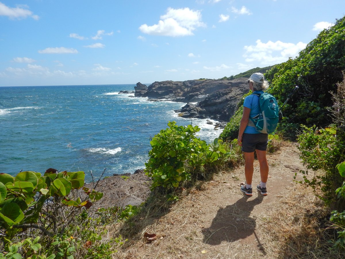 After a couple of hours, we made it safely to the Caravelle Peninsula and parked when the road turned into a dirt track. Most people were driving up the dirt track for a kilometre to another car park, but the road looked very rough for our little hire car. We walked up to the car park, where we joined the well-marked trail which goes around the end of the peninsula.