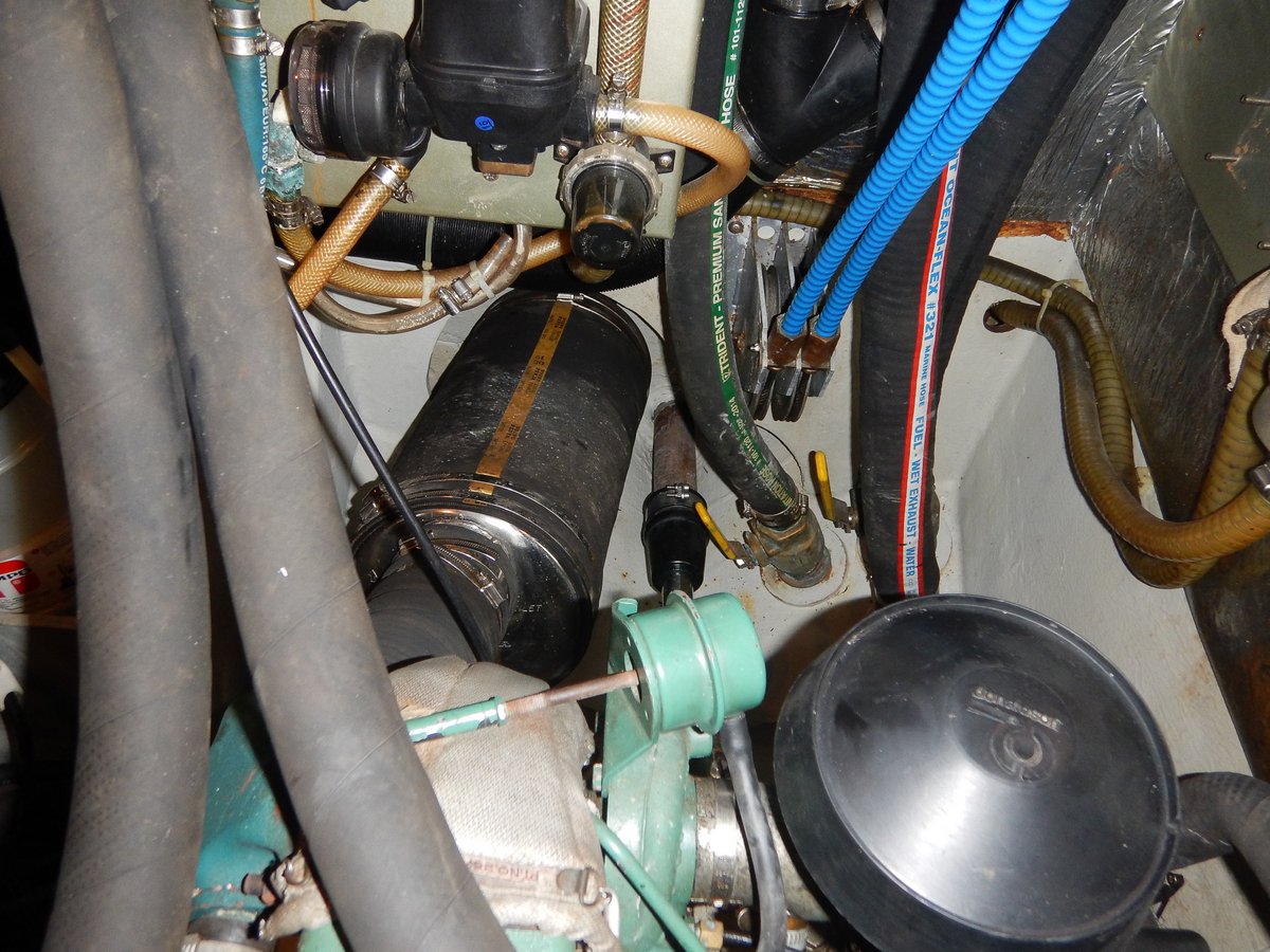Big mistake… The exhaust is connected to 4 inch diameter rubber, reinforced exhaust hose. I removed the hose clamps and disassembled the engine room side of the exhaust, but the aft end goes through a bulkhead into a small bilge in the aft cabin. After 20 minutes of thrutching, twisting and cursing, it was apparent that the hose would have to be cut off, so I abandoned the idea and put the exhaust back together - a waste of a couple of hours.