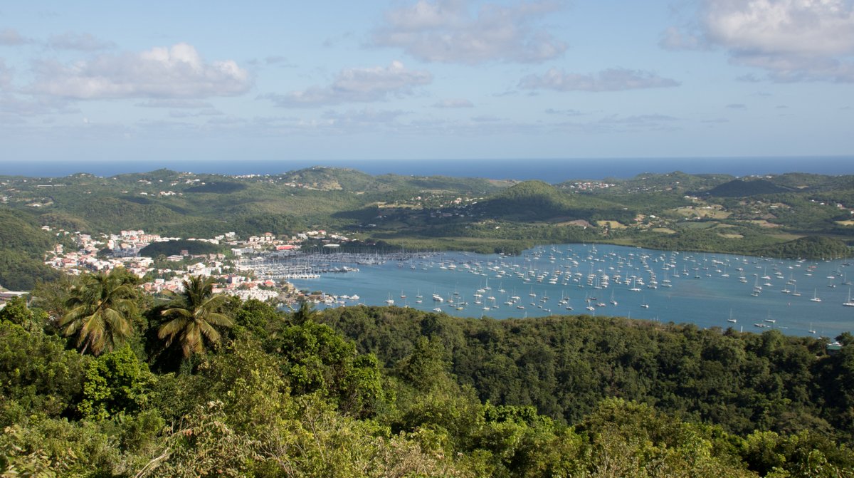 We took a long dinghy ride to Marin which is 2.5 miles from where we are anchored. The route we took was to pass close to the end of the pier at the Club Med resort and then head for a red buoy on the other side of the reef. We followed a sand patch over the shallows, but I think that there’s enough depth as long as you don’t stray too far from the beach. Once around the headland there was a tough up wind mile, bashing into 2 foot wind waves.