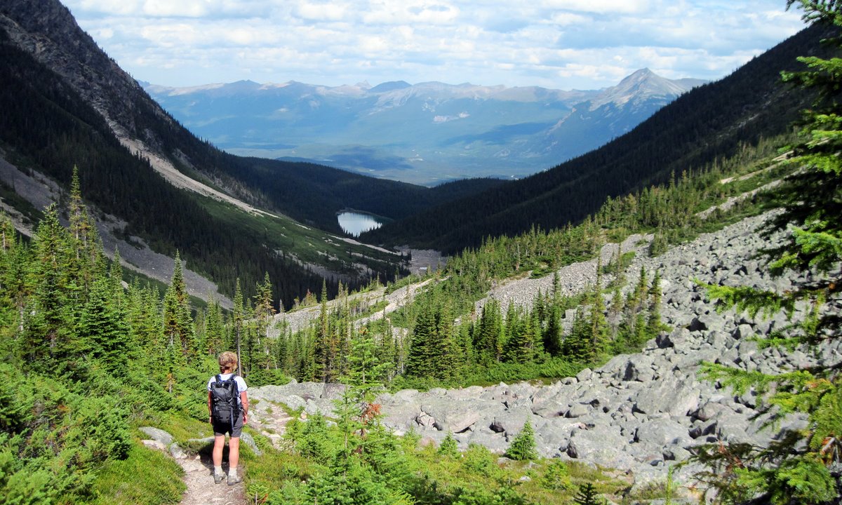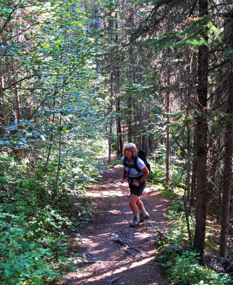 More boulder fields and wooded areas led past a small lake and impressive waterfall running off the second lake. The trail then goes up a very steep (and horrible) scree slope on the left of the waterfall which leads to the second lake through a nice path. We saw bear scat on this path, which increased Glenys’s “Bear Alert” nerves.