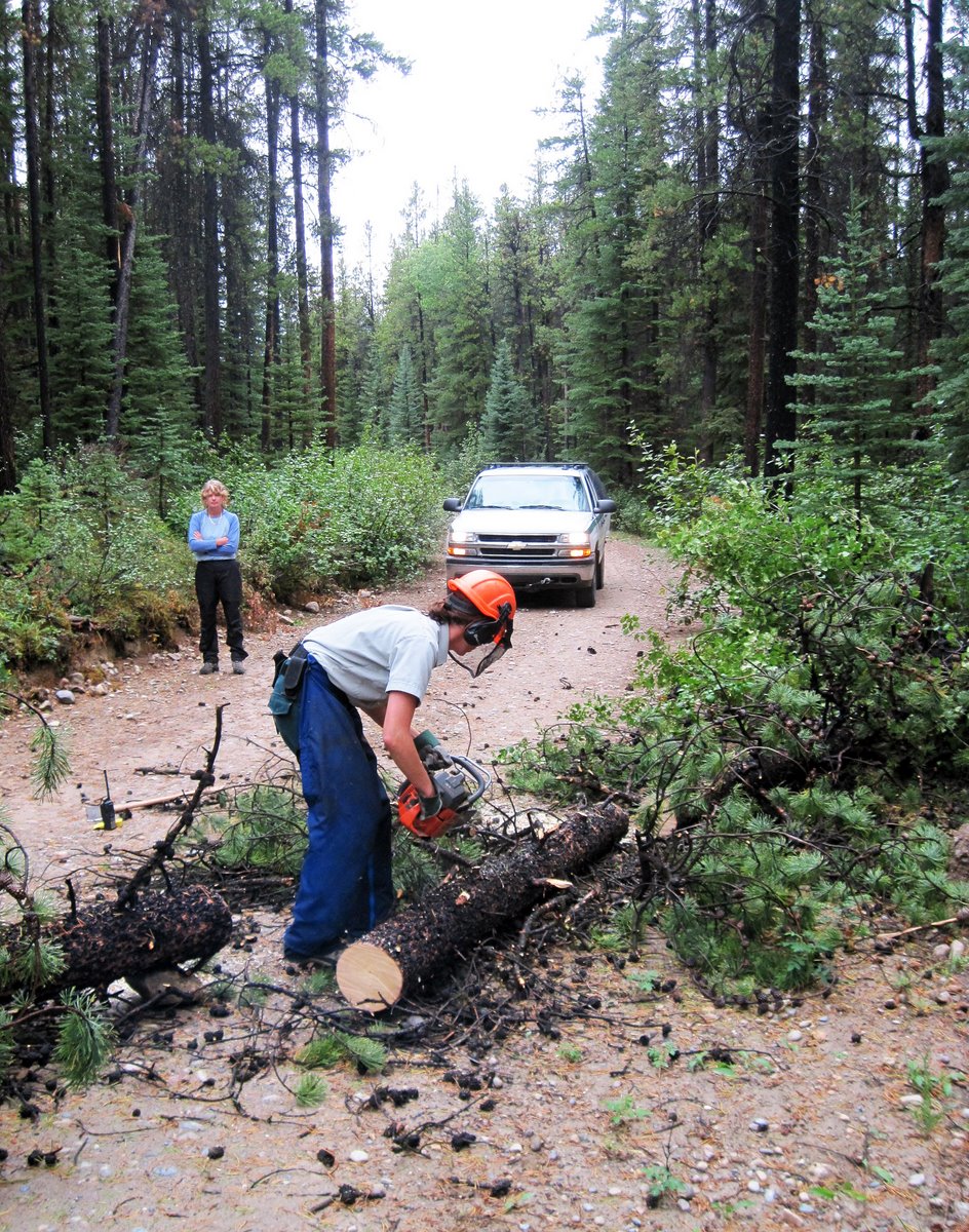 The next few trees were smaller and Jen cleared them without a problem. We arrived at the fifth one and it was in tension and thicker, on a slope. She radioed in to her station and said that there were 10 more trees and they said that they would send some one to assist.