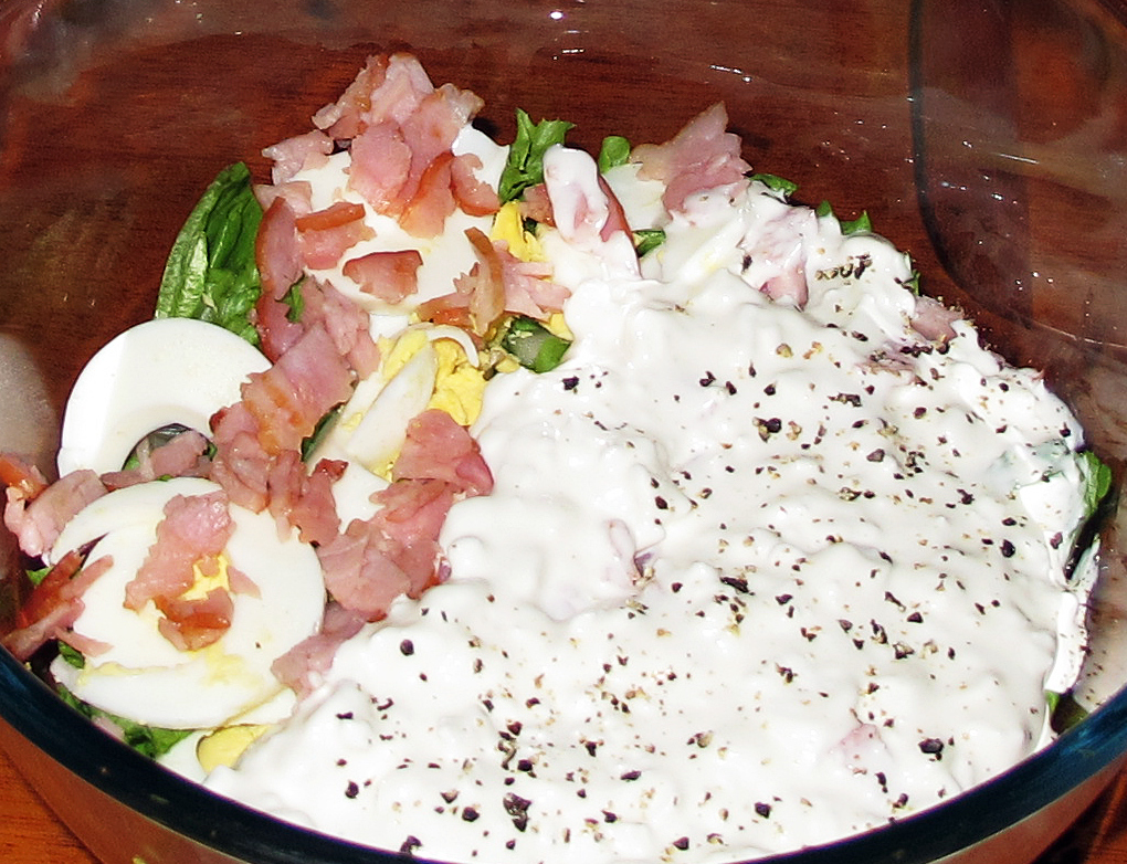 Put the base layer ingredients in a large serving bowl, toss in a little dash of oil and vinegar and stir. Cover with the bacon and egg. Mix the top layer ingredients and spoon over the mid layer. Sprinkle some chopped chives or alfalfa sprouts over the top.