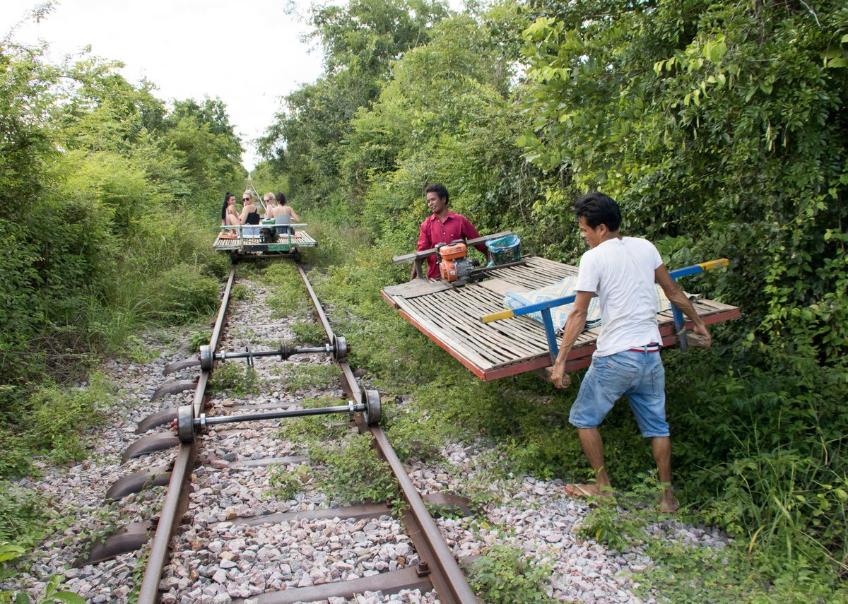 The bamboo trains are now only a tourist attraction, the main one being in Battambang along seven 7 kilometres of warped, misaligned rails. There are about twenty of these bamboo trains operating on the single track, going backwards and forwards all day. The trains take tourists to the end of the track and back. Of course at the end of the track, there are a number of stalls selling souvenirs.
