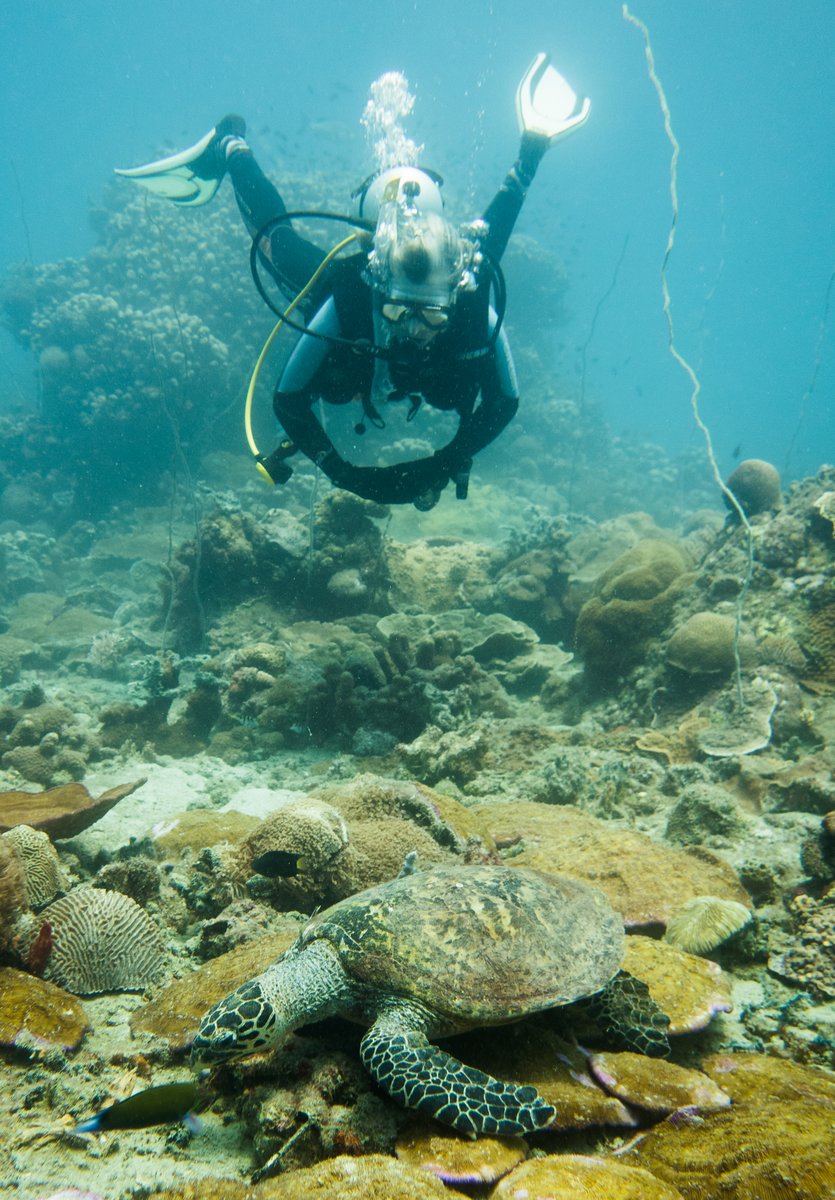 It was a great dive despite the visibility being only 10 metres. There were lots of big snapper, groupers and blue-spotted sting rays who were very unafraid (until I stuck my camera in their face). We saw six nudibranchs (2 species) and a similar number of big tiger cowries. A Hawksbill turtle popped over to say hello and we spent five minutes with it – it was very unconcerned. The hard and soft coral was in good condition and sponges were dotted around the reef - shows the value of a Marine Park.