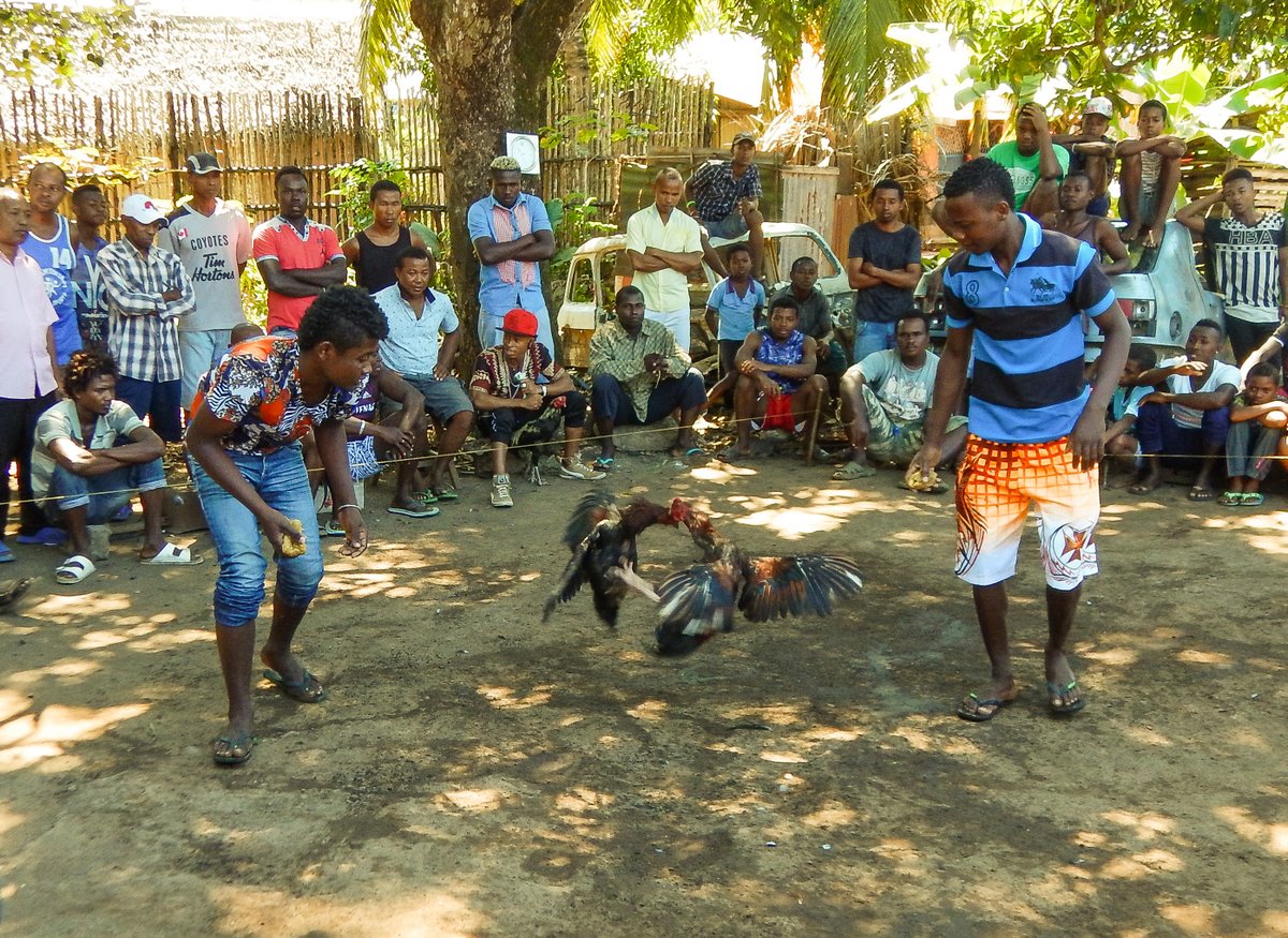 On the way back, we came across a large group of men stood in a circle shouting. It looked like a man-only thing, so Glenys walked a little way along the road, while I went to investigate - it was a cockfight. Two cocks were locked in combat, pecking each other’s heads and occasionally leaping up, lashing at each other with their feet. Their handlers were coaxing them to fight by (bizarrely) splashing water on their feet.
