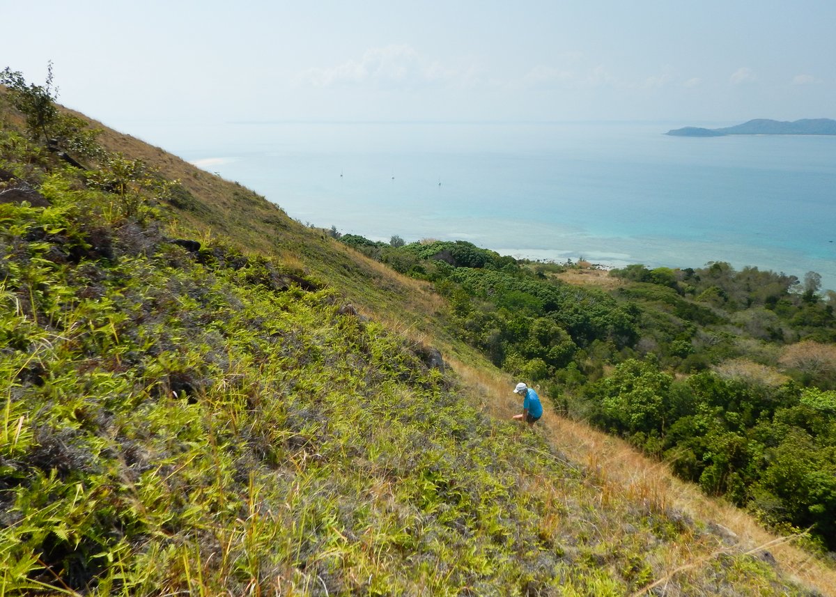 Unfortunately, the indistinct paths seemed to be circumnavigating the hill, with no path leading up the hill (why would the locals want to go up there?). We dived into the bush and weaved our way steadily upwards. Eventually, we came out of the trees onto a 40-degree slope heading up the hill. It was covered with long grasses and ferns, with no sign of a trail, so I just headed up scrambling through the waist high vegetation, wondering if there were snakes on this island.